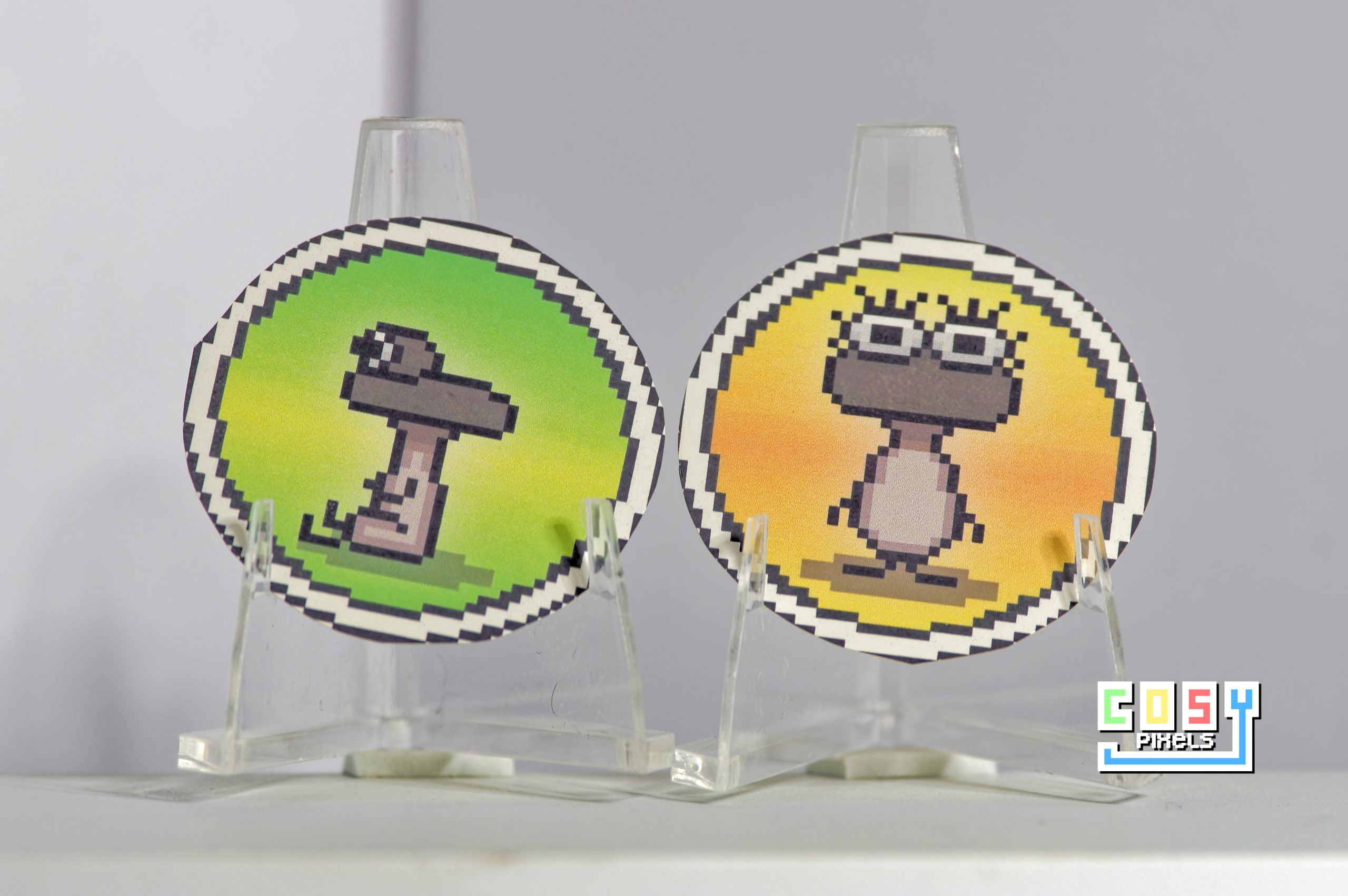 Every badge and sticker is hand-drawn digitally, using pixel art. Stickers are then printed at home on premium gloss or matte sticker paper, then carefully hand-cut using scissors and a hand cutter. Badges are printed at home on premium gloss photo paper, before being cut into a circle and pressed into a 32mm badge!