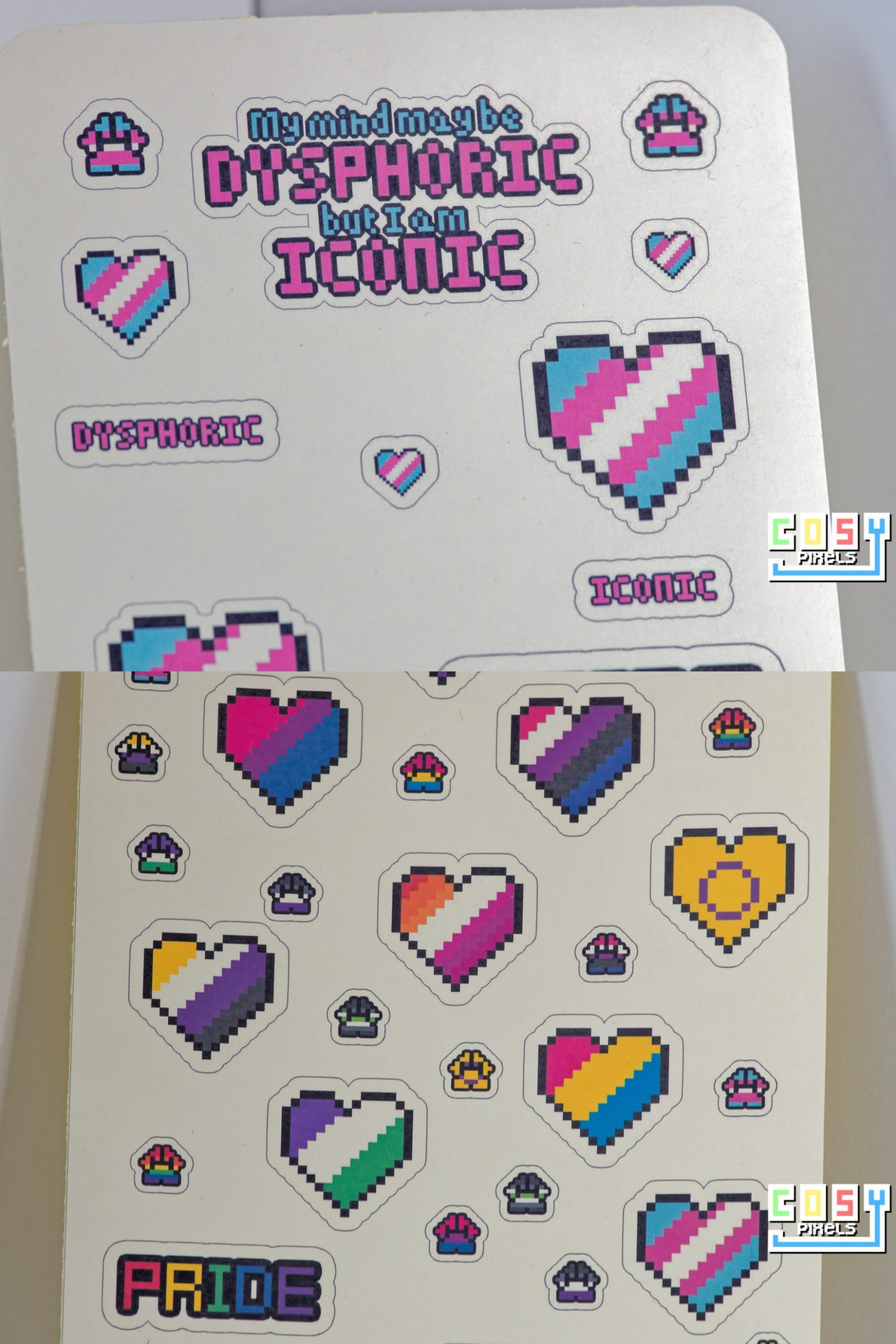 A6 Pixel Pride Sticker Sheet – “My mind may be dysphoric but I am iconic”