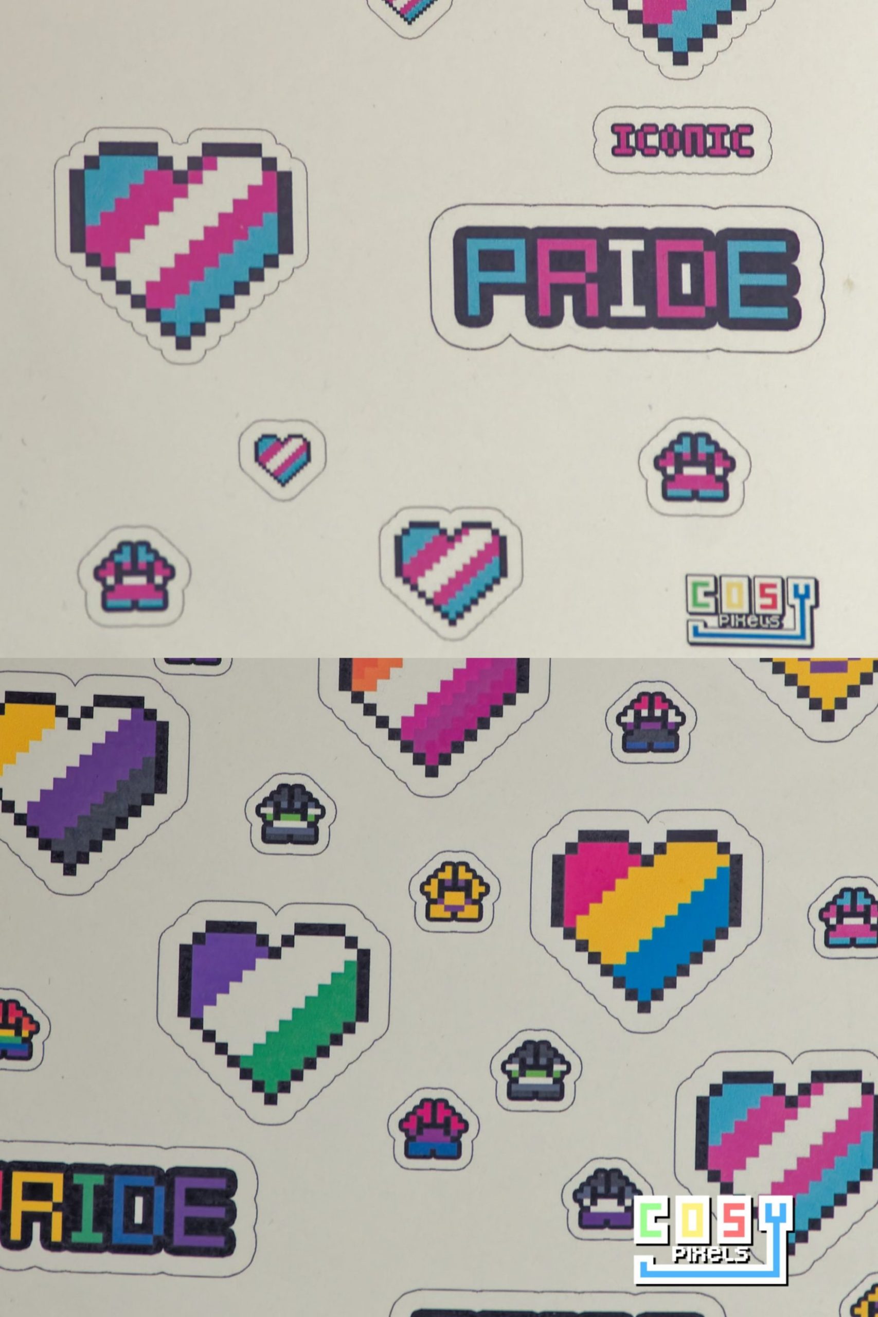 Add a vibrant touch of pixel pride to your crafts, journals, or gift wrapping with this A5 sticker sheet featuring adorable hearts and paws inspired by 11 LGBTQIA+ flags!