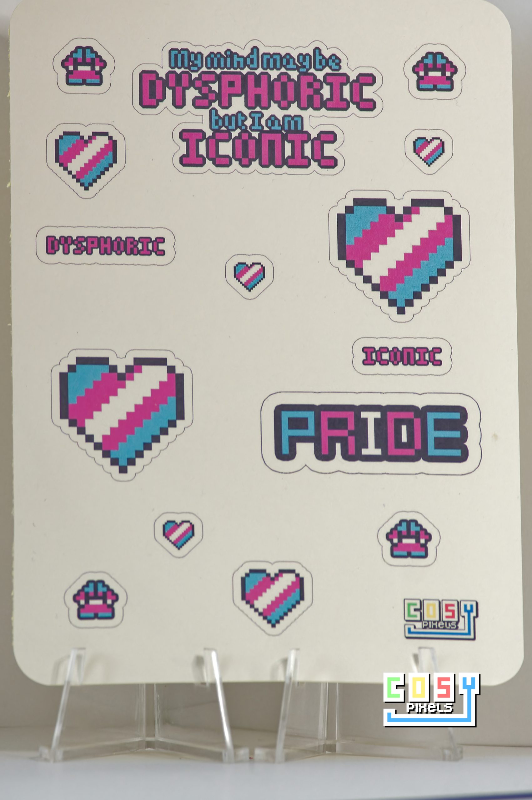 Celebrate self-expression and trans pride with this vibrant A6 sticker sheet, filled with 15 pixel art designs! The main stickers message is: “My mind may be dysphoric but I am iconic.” This nods at gender dysmorphia, and overcoming the challenges it brings. The rest of the sheet is packed with colourful pixel hearts and cute paw prints—perfect for decorating journals, laptops, and more.