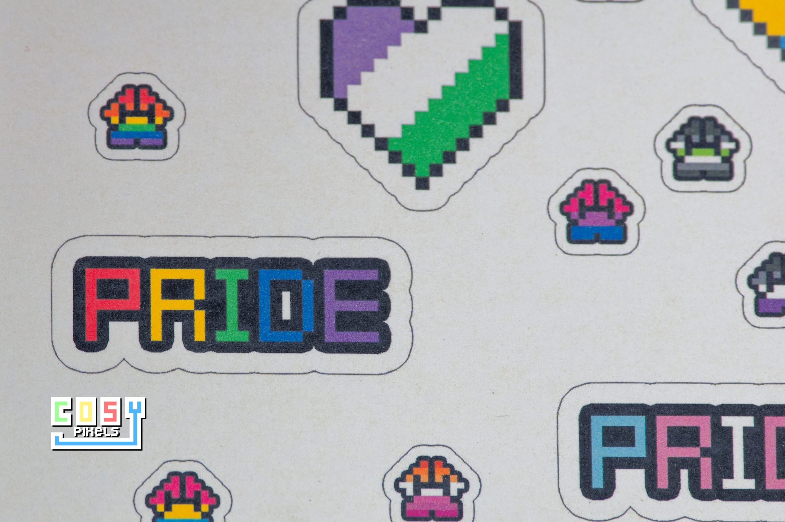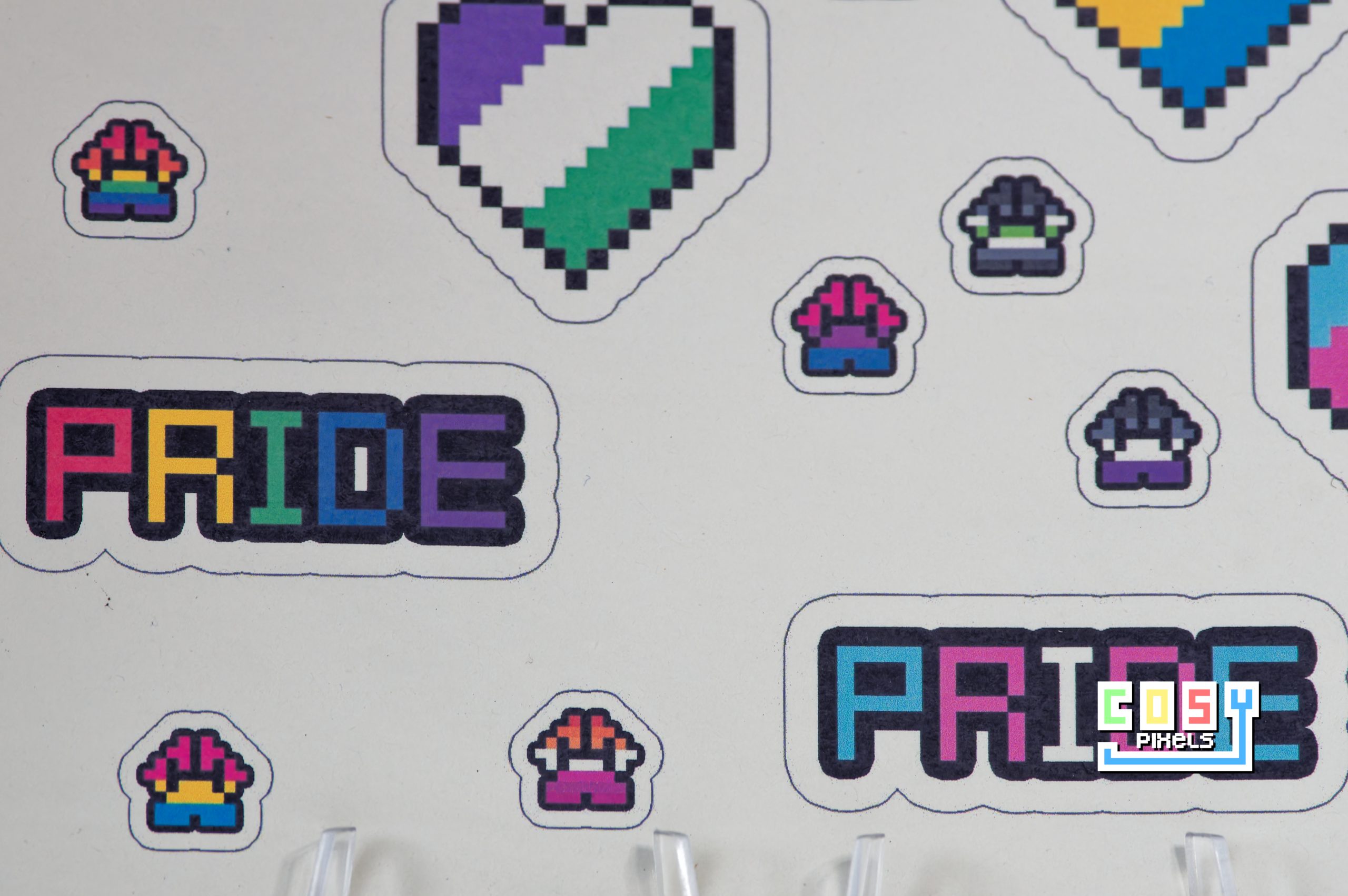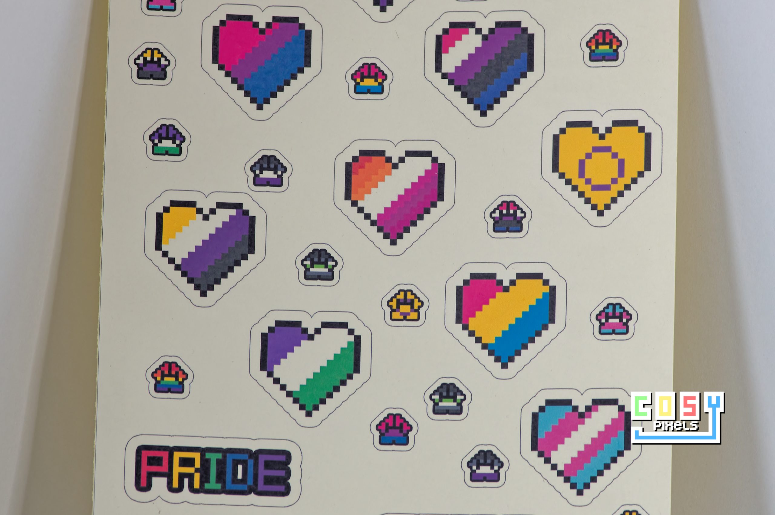 Add a vibrant touch of pixel pride to your crafts, journals, or gift wrapping with this A5 sticker sheet featuring adorable hearts and paws inspired by 11 LGBTQIA+ flags!