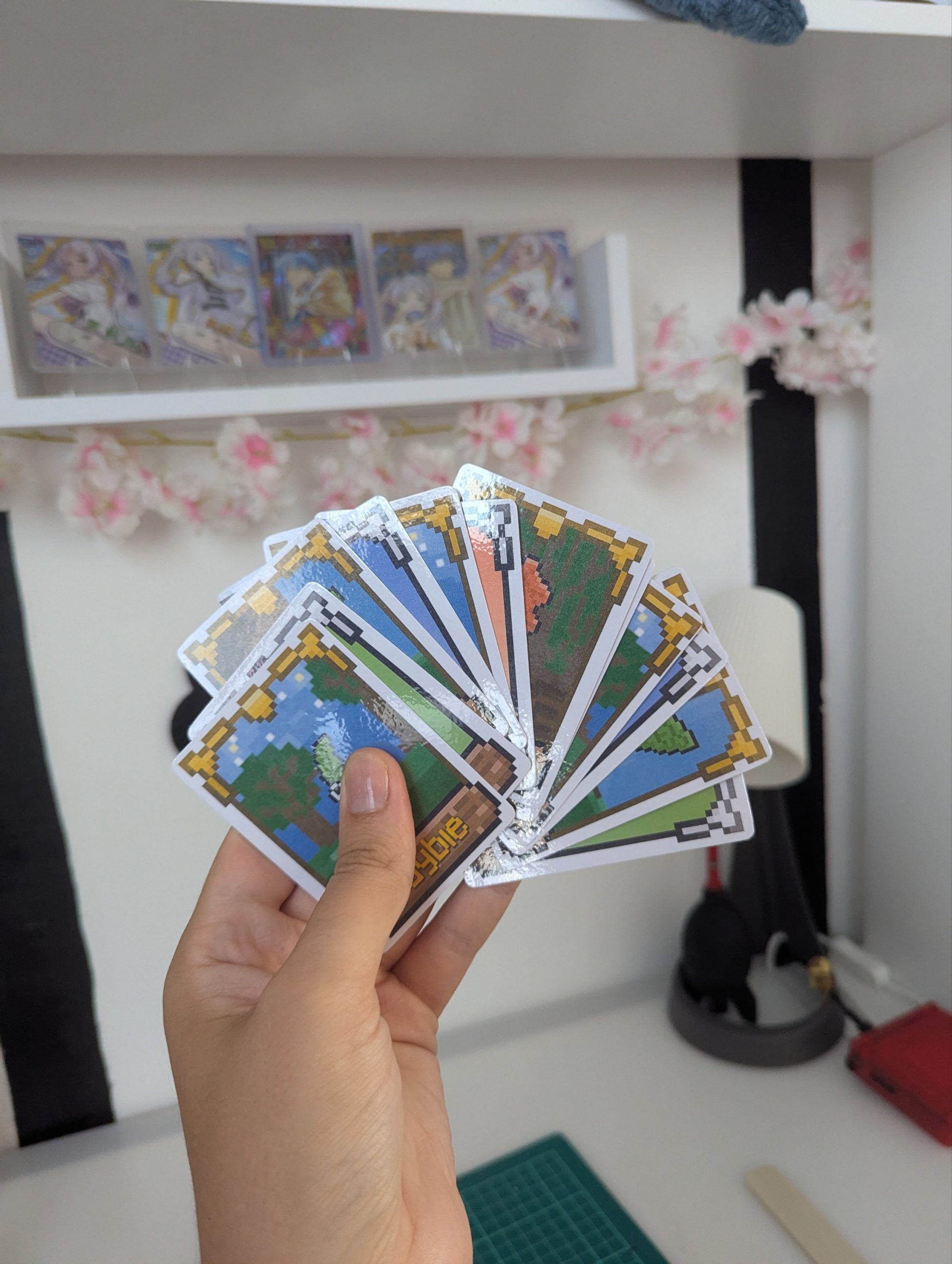 All cards are hand-drawn and designed by me, then printed and mounted at home, followed by lamination and sealing for durability. The booster packs themselves are digitally designed and printed on cardstock, then folded into shape.